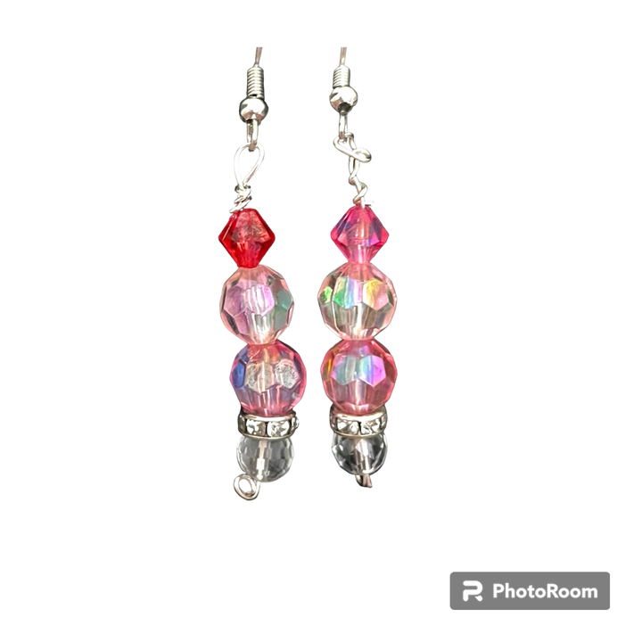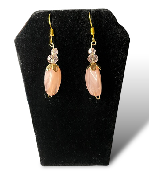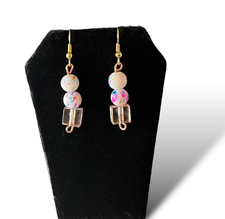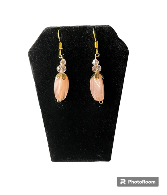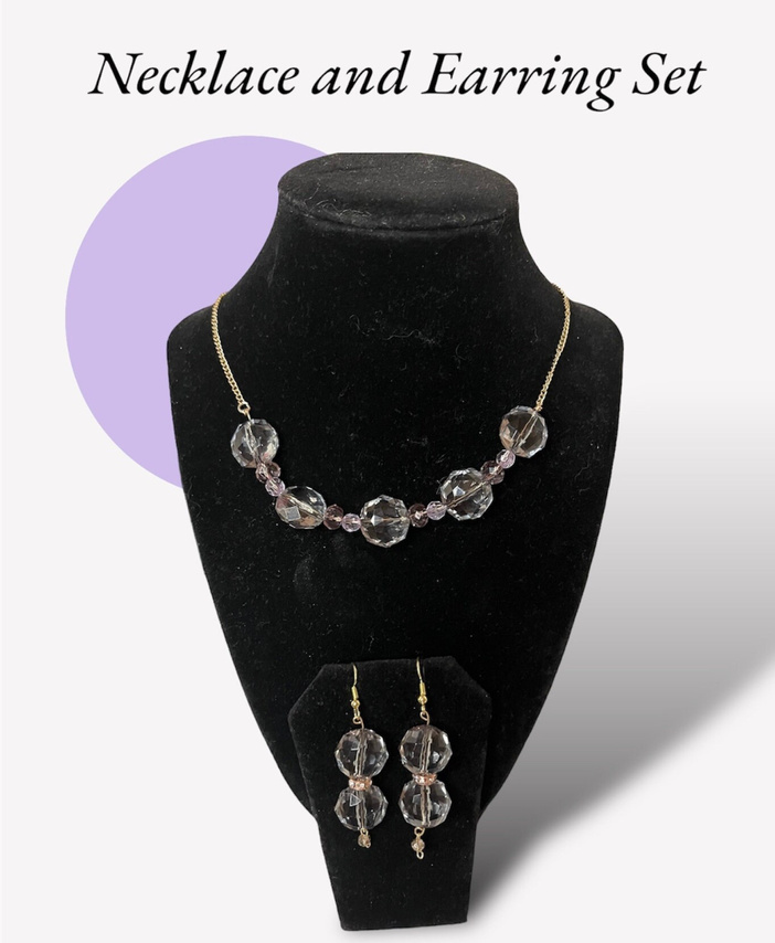 This handmade jewelry set consists of an intricate beaded necklace with matching dangling earrings.