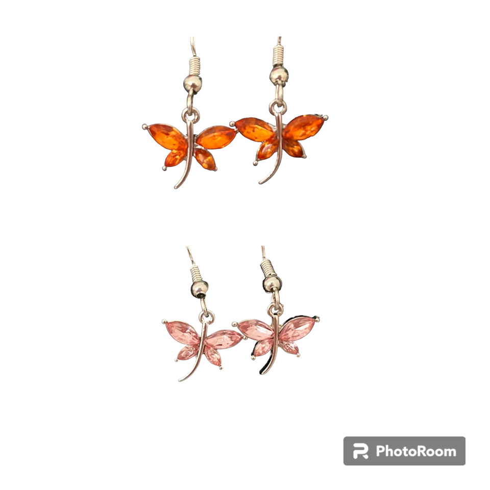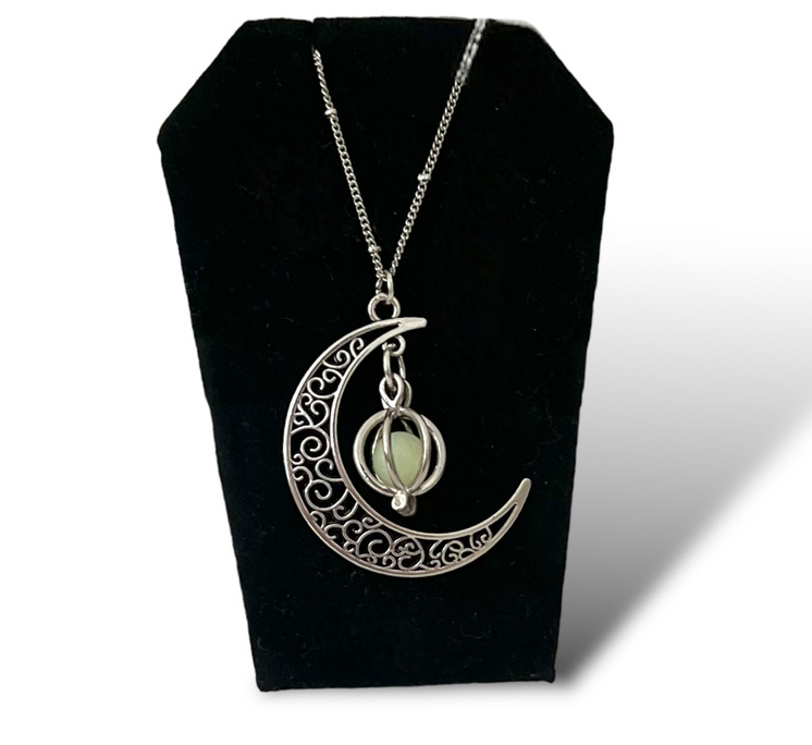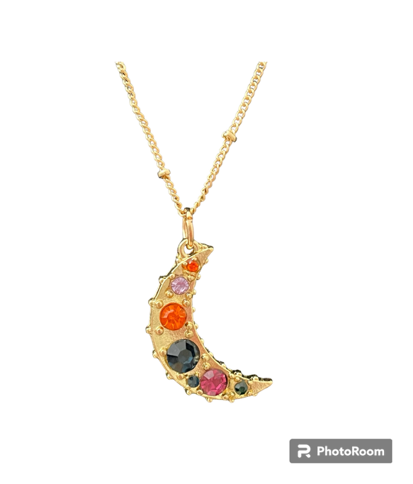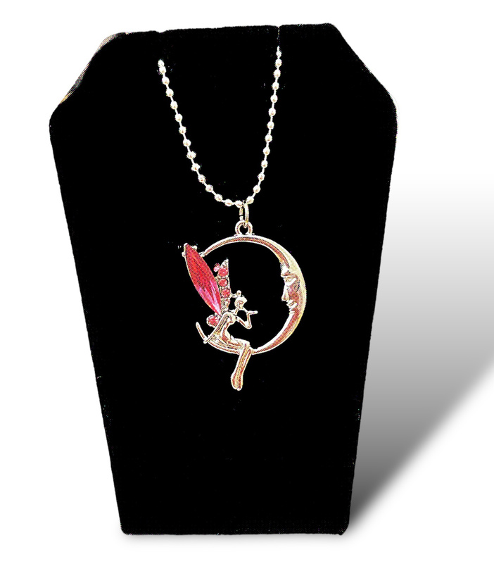 A delicate shape of a crescent moon with a face with a fairy sitting on the bottom. The fairy's wings are made from rose colored rhinestones.